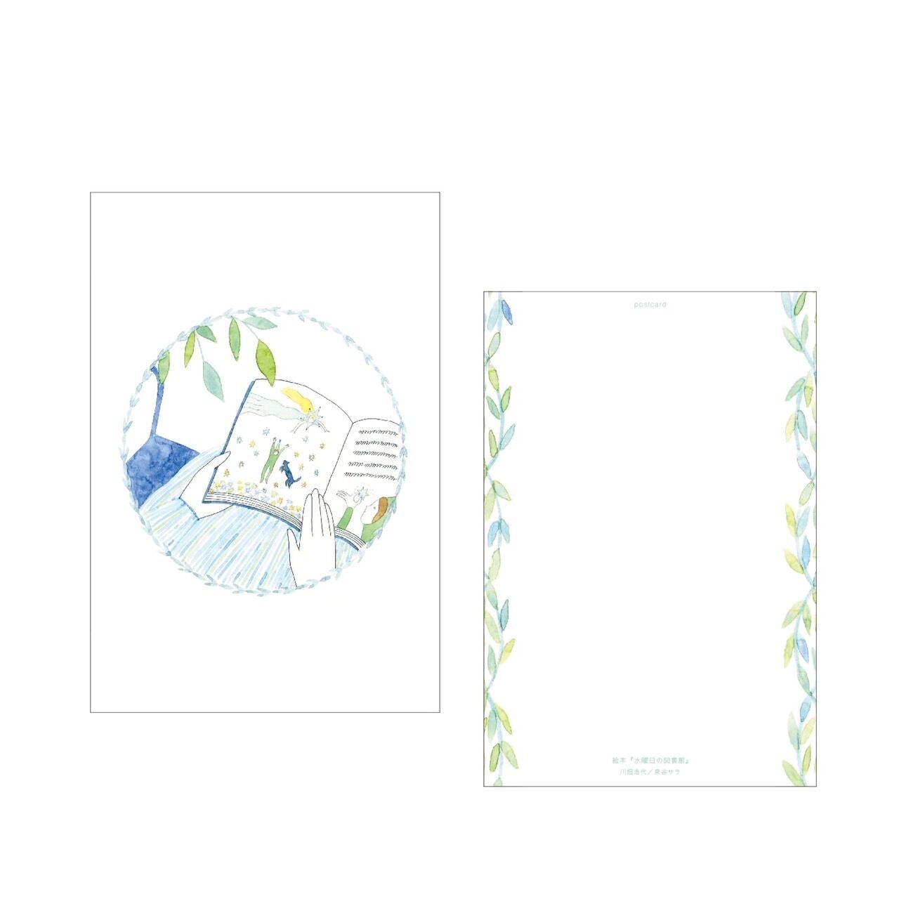 「水曜日の図書館」は、心温まるストーリーと美しいイラストで描かれた重量感あるハードカバーの絵本です。この商品は、絵本と一緒にポストカード3枚とシークレットポストカード2枚の5枚組となります。